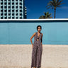 Based on a vintage print, these cats are the running motif of a small capsule we made in viscose. We've had this jumpsuit in the past with seahorses and leopards and they instantly sold out, so we've brought her back. It fits so well! Black base, pink cats. Slightly cropped. Deep V neck with circular keyhole.